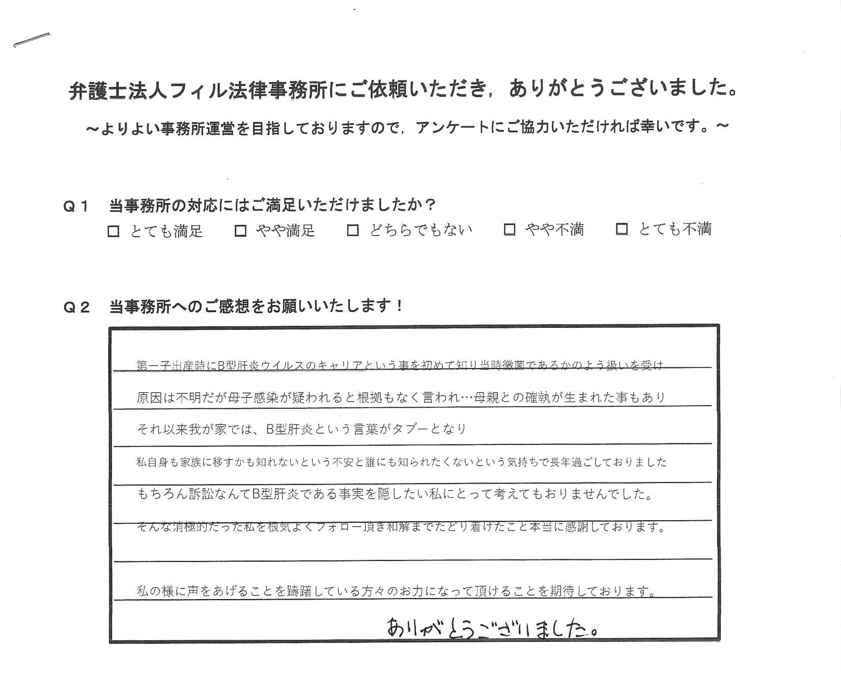B型肝炎この度はお世話になりありがとうございました。 ひとつひとつ丁寧に説明の連絡に最初抱いていた不安が減って行き安心して頂く指示に従えました。 年金生活ですので検査費用が公費負担になり経済的にも気分的に救われました。 貴事務所の益々のご隆盛を祈念しております。 感謝 ...