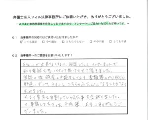 初めて弁護士さんに、お願いする事案に何も知らない自分に、親切にわかりやすく対応してくれた先生と事務局の方々、安心してまかせていました。 相談に伺った日以後、肩の重しがとれたようで、気持ちが少し軽くなりました。 本当にありがとうございました。 和田先生、山田さん、事務局の方々、本当にありがとうございました。 ...