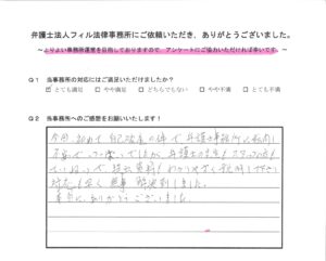 今回、初めて自己破産の件で弁護士事務所に訪問し不安でいっぱいでしたが、弁護士の先生もスタッフの方もていねいで、提出資料もわかりやすく説明して下さり対応も早く、無事解決致しました。