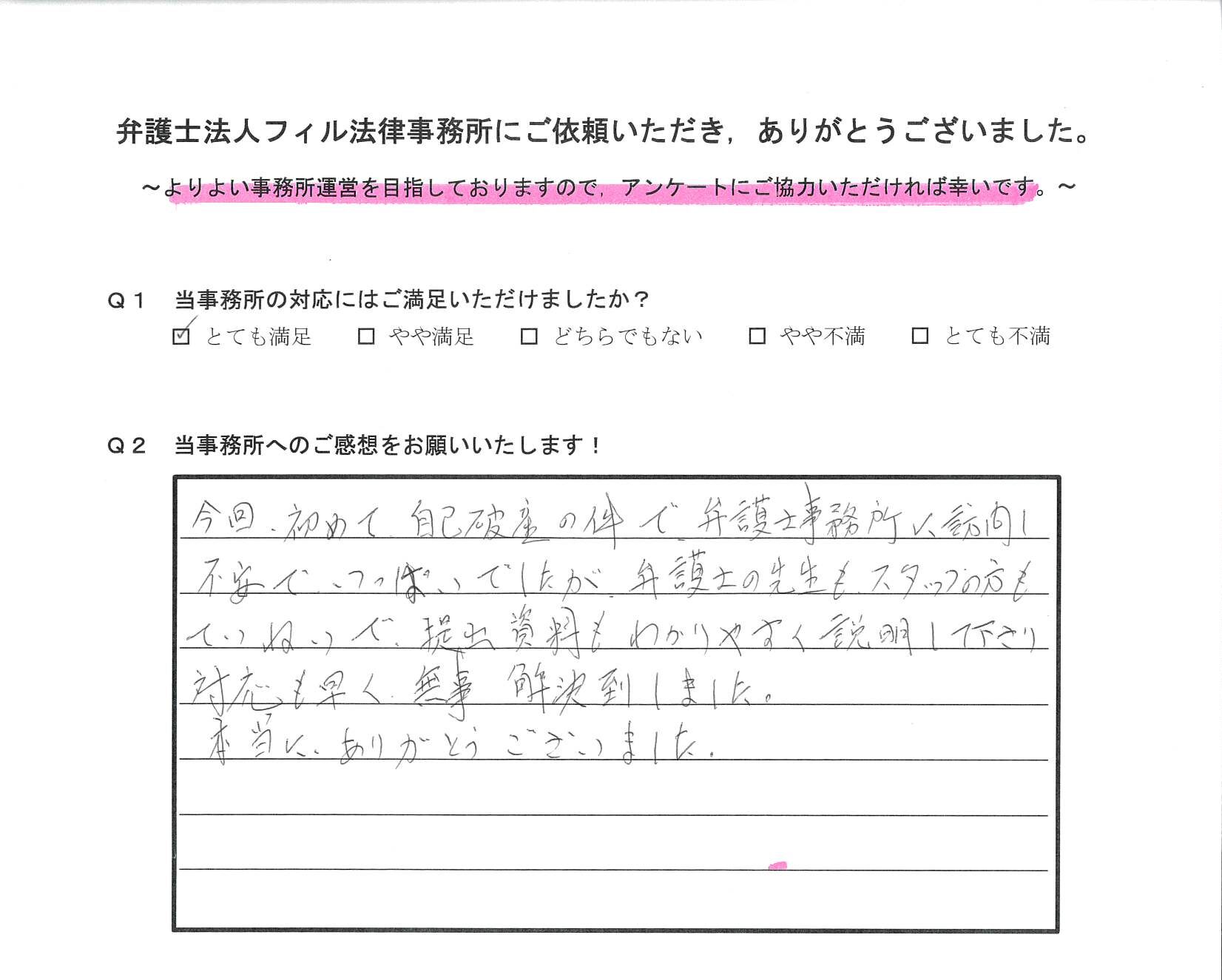 今回、初めて自己破産の件で弁護士事務所に訪問し不安でいっぱいでしたが、弁護士の先生もスタッフの方もていねいで、提出資料もわかりやすく説明して下さり対応も早く、無事解決致しました。