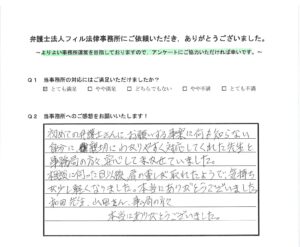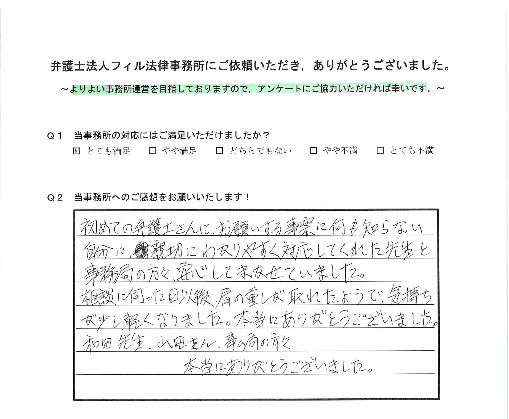 初めて弁護士さんに、お願いする事案に何も知らない自分に、親切にわかりやすく対応してくれた先生と事務局の方々、安心してまかせていました。